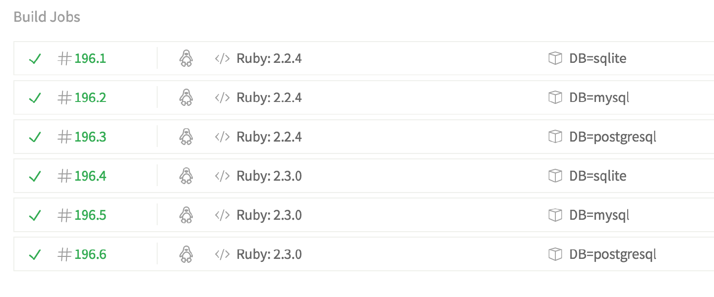This, in combination with our database setup, will trigger six builds. Sqlite, MySQL and PostgreSQL builds on ruby-2.2.4 and on ruby-2.3.0.