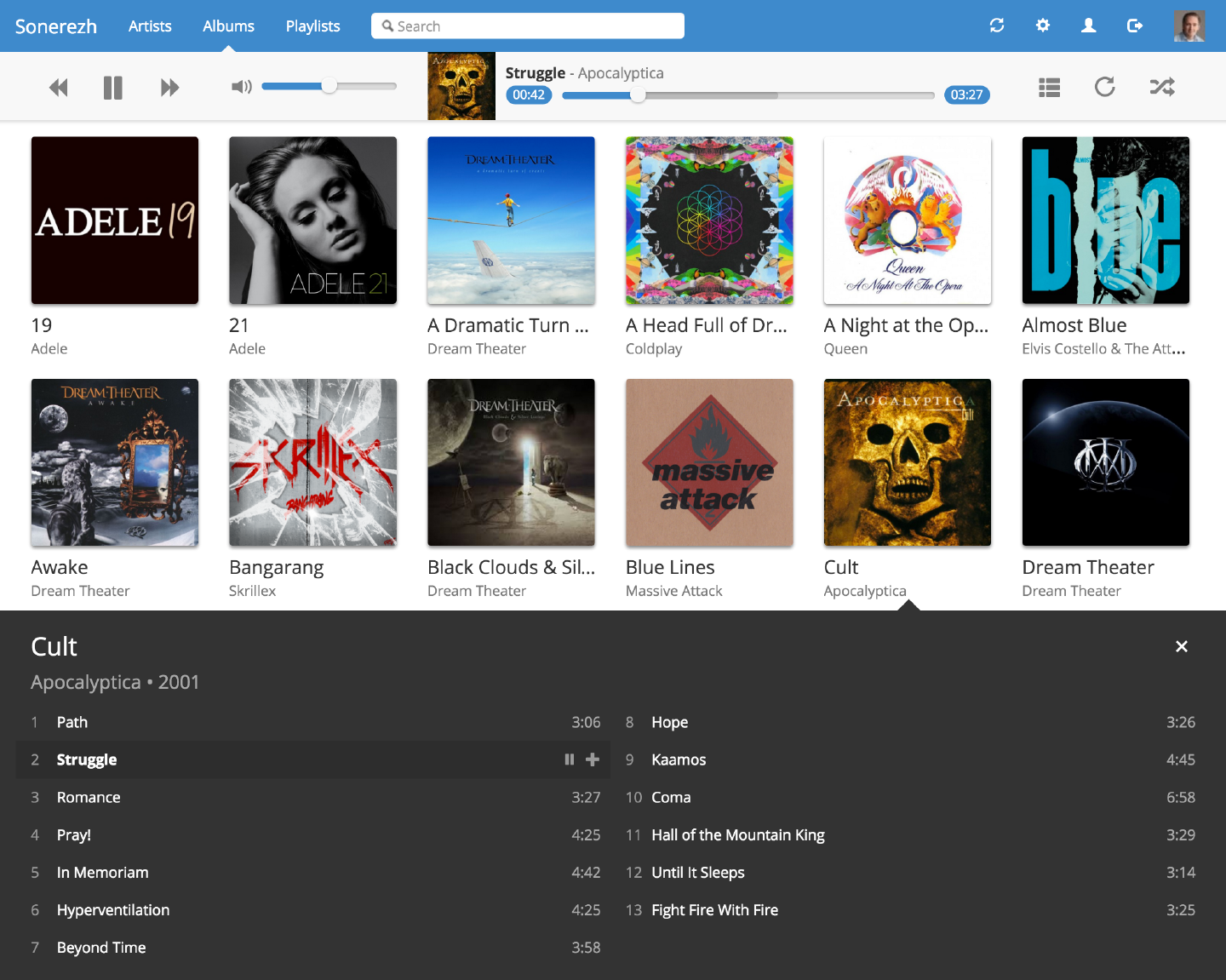 I feel Koel is still too early in its development and I didn’t want some bloated music player like Ampache or Subsonic. Then I stumbled up Sonerezh. It has a clean iTunes-esque interface and just works.