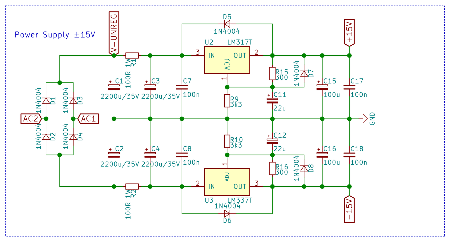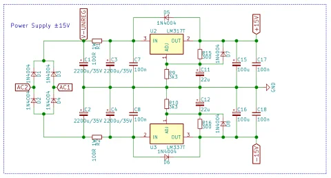 The power supply is normally the last thing I design. When everything else is finished, I have a clear picture of power supply needs. Because the main components are a pair of OPA2134 opamps, I want to have a clean ±15VDC power supply. The OPA2134 can be supplied with up to ±18VDC, but ±15VDC seems more than adequate for the job. ±15VDC is also what Elliot recommends in his design.