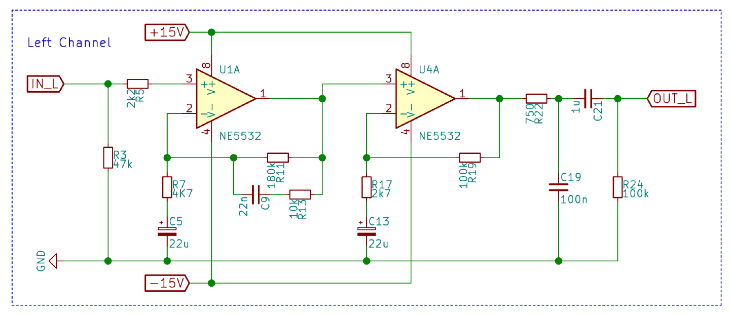 Below is left channel preamp circuit, the right channel is identical. Most notable detail is the OPA2134, which is a dual channel opamp. One unit is used for L+R RIAA equalisation and another unit is used for amplification.