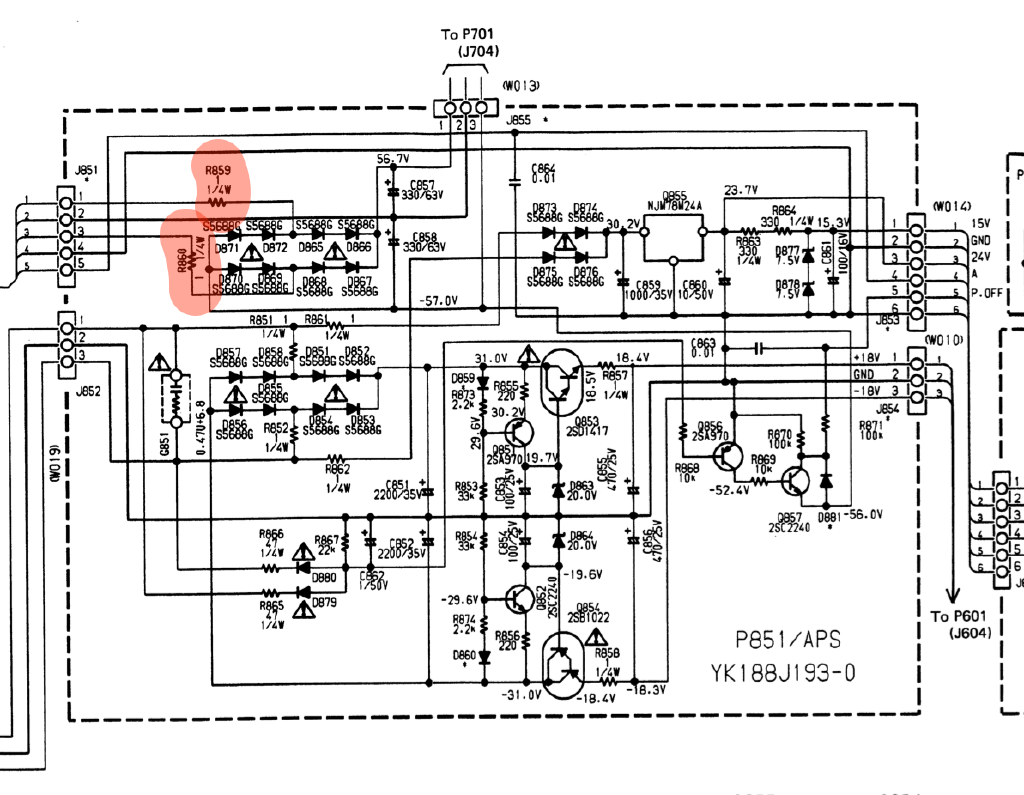 Capacitors C857 and C858 appeared in good working condition (no damage, leaking, buldging). All diodes (D865-D872) measured at a nice 0.6Vf.