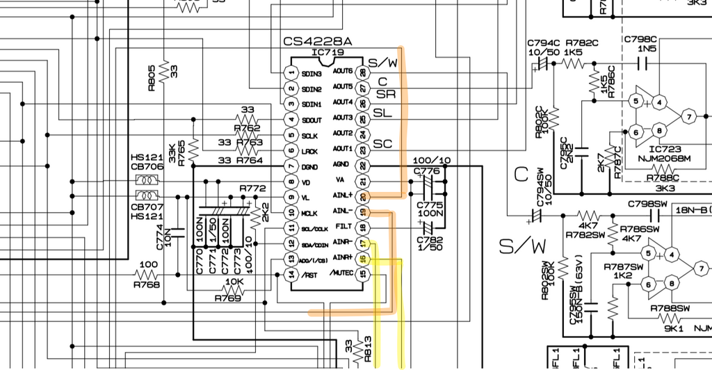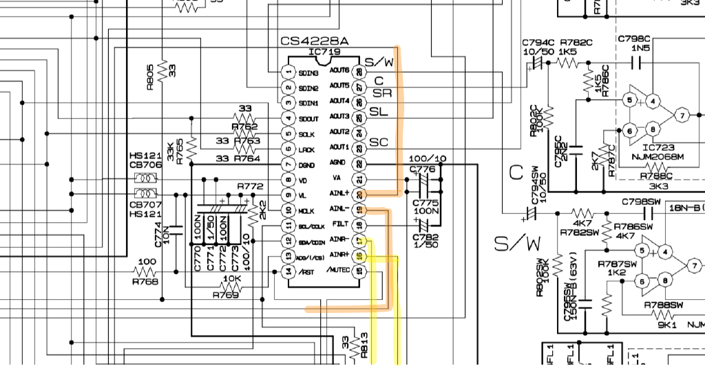 To be sure I checked the analog input signal for the L+R channels as well. They end up in IC719. This IC does several things, but most importantly it has two ADCs to convert L+R channels to digital, and it features six DACs which are used for center, surround and subwoofer channels. Since the analog singal is coming in ok and the right surround channel is also working fine, I’m inclined to assume the digital processing of the right channel is also fine.